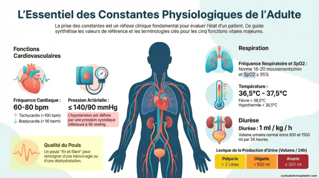 Valeurs habituelles = 60 à 80 pulsation / minute (chez l’adulte au repos). Les limites sont les mêmes que la fréquence cardiaque.