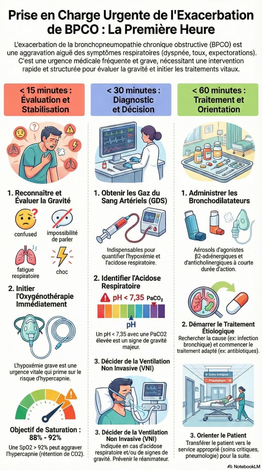 - < 15 min : Reconnaître l’exacerbation, évaluer la gravité et débuter l’oxygène.
