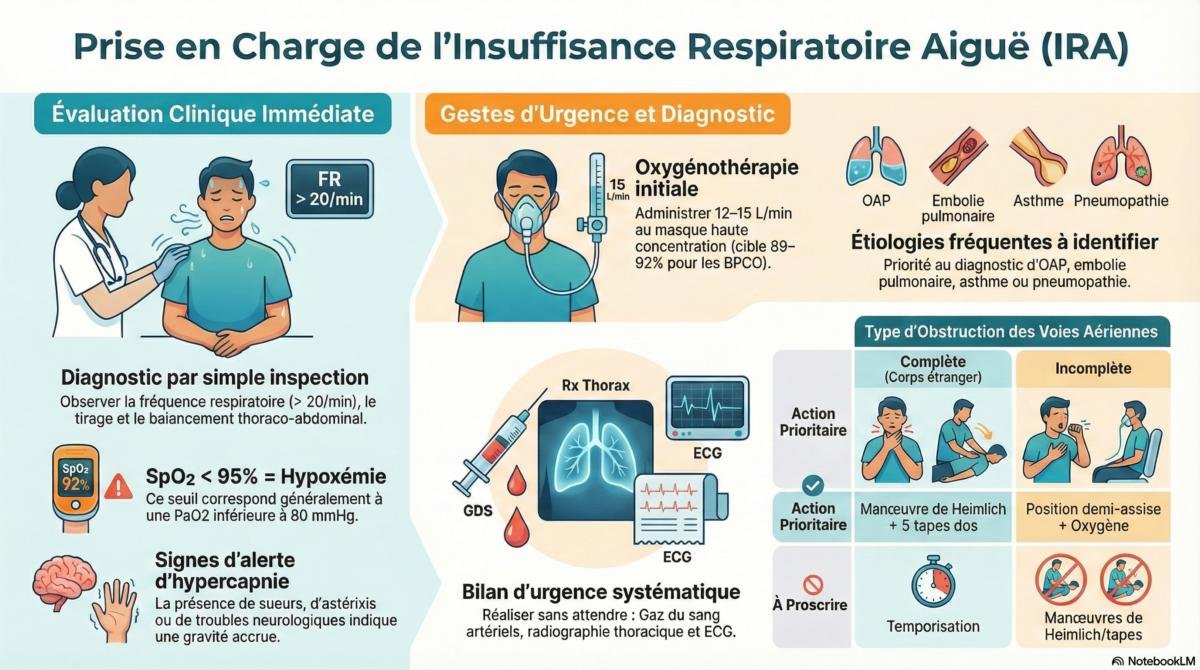 éliminer une obstruction haute, administrer de l’oxygène, surveiller et réévaluer, puis rechercher la cause.
